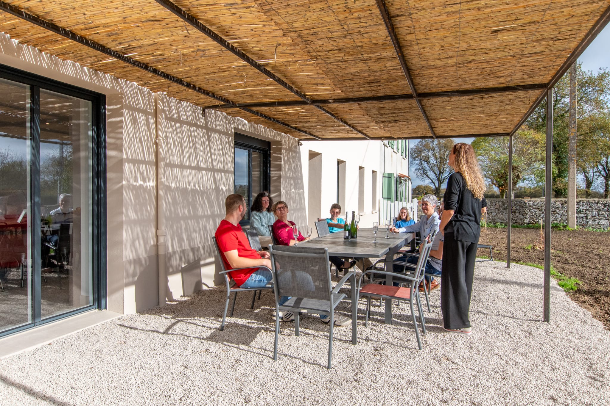 À l’extérieur, une terrasse ou un petit jardin privatif (selon ton installation réelle) devient un vrai refuge : petit-déjeuner au soleil, lecture à l’ombre, soirée tranquille en contemplant la campagne… Ici, le temps ralentit et l’on profite de chaque instant.